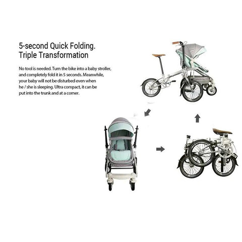 5-second quick folding, the combination of functions of folding bike, baby stroller, and easy storage. This parent-child bike can be ridden or changed into a four-wheeled baby cart to push
