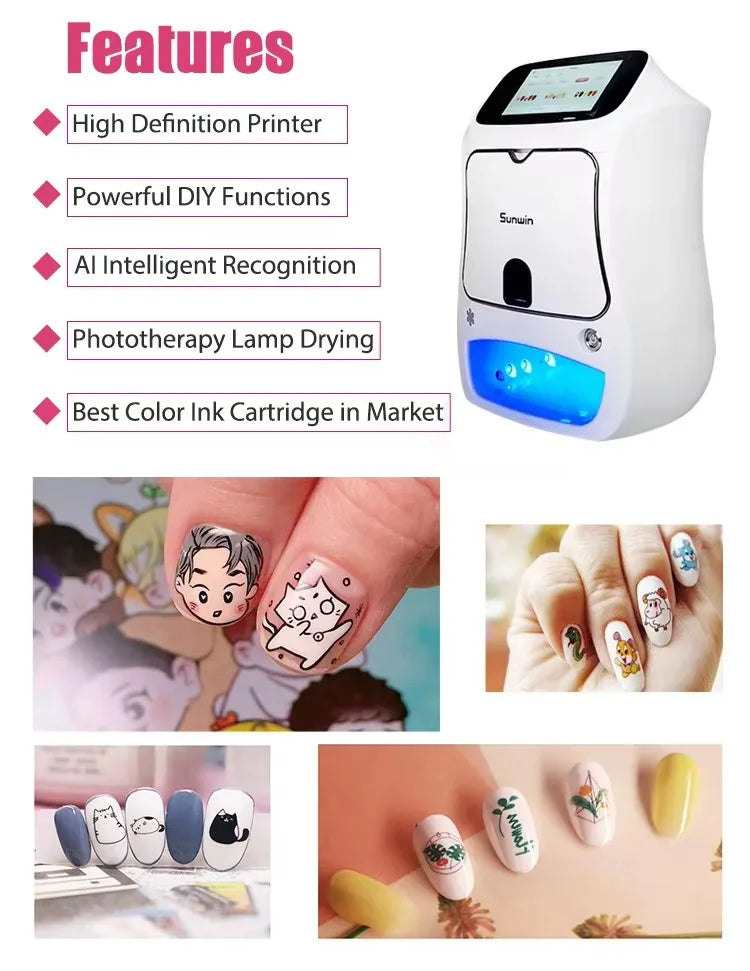 The 3D Portable Digital Art Nail Automatic Printer is a cutting-edge device designed to revolutionize your nail art experience. Compact and lightweight, this innovative printer allows you to create intricate, professional-quality nail designs quickly and effortlessly at home or on the go. Equipped with advanced 3D printing technology, it offers exceptional precision in reproducing detailed patterns, from simple motifs to complex artworks. User-friendly controls and compatibility with custom digital designs make it perfect for both beginners and professionals looking to elevate their nail styling game.