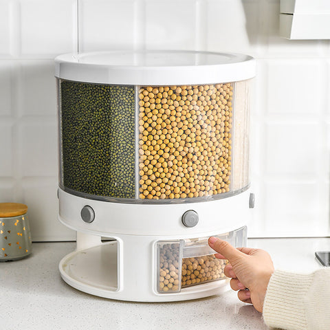 This 6 grid rotating rice storage box dispenser is designed to make your rice storage more convenient and efficient. This 6 grid rotating rice storage box dispenser is used to store rice or any other food items and keep the food fresh for a long time. The lid is made of clear plastic, so it’s easy to see the food inside. The Quantity-displaying holder rotates 360 degrees for easy viewing of contents.