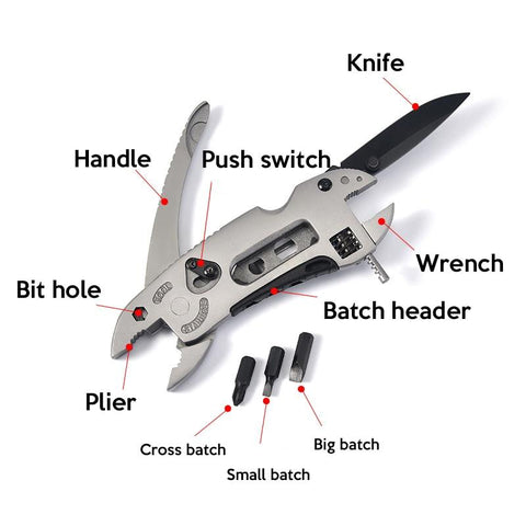 - Can be used as a knife, plier, spanner, wrench, screwdriver, wire cutter