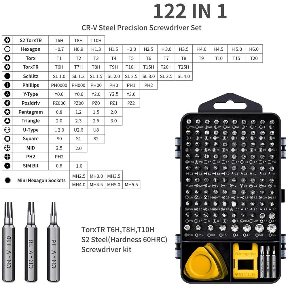 122 in 1 Multifunction Screwdriver Kit: The 122 in 1 screwdriver set includes 98 screwdriver bits, 3TorxTR screwdriver bits, 1 magnetized driver handle, 1 magnetizer/demagnetizer, 1 flexible extension shaft, 1 hexagonal sleeve socket for cordless drills, 1 anti-static tweezer, 2 plastic pry crowbars,3 ultra-thin & 6 normal triangle pry tools, 1 micro screw magnetic pad, 1 SIM card pin and 1 suction cup.