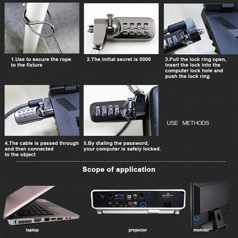 Make the electric cable through the keyhole,and then connect to the object, password and your computer is safely locked.Pull open the lock ring, insert the lock into the computer lock hole and push the locking ring.