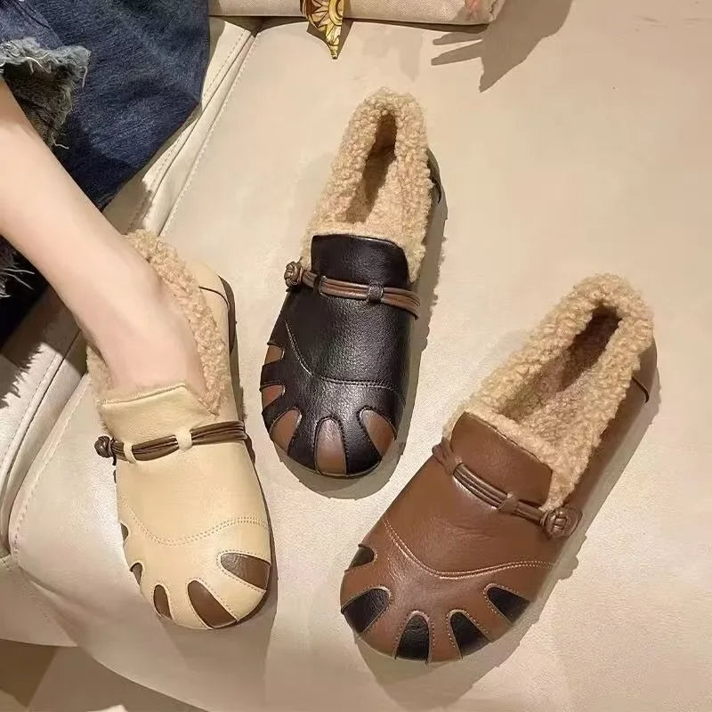 These shoes feature a plush fur lining that ensures warmth and coziness, while their fashionable design adds a touch of elegance to any autumn outfit, making them perfect for both indoor and outdoor wear.??
