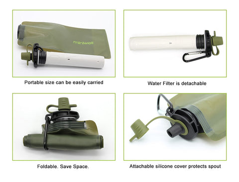 Filter straw can be detached from the collapsible bottles and used by itself to act as a filtration straw.