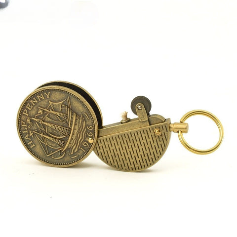 The Coin Keychain Flame Kerosene Lighter is made of durable metal and features a keychain loop, so you can easily attach it to your keys or bag. It has a classic coin design on the front, making it a stylish addition to your collection.