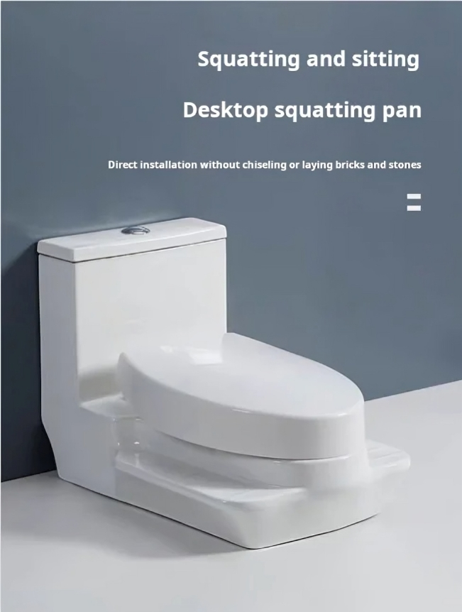 This Convertible Toilet is a innovative toilet system that offers the flexibility of both a squat toilet and a sit-down toilet in one unit. This unique design allows users to easily switch between squatting and sitting positions based on their preference or comfort. The squatting position is believed to have health benefits, while the sitting position provides familiarity and convenience for users.