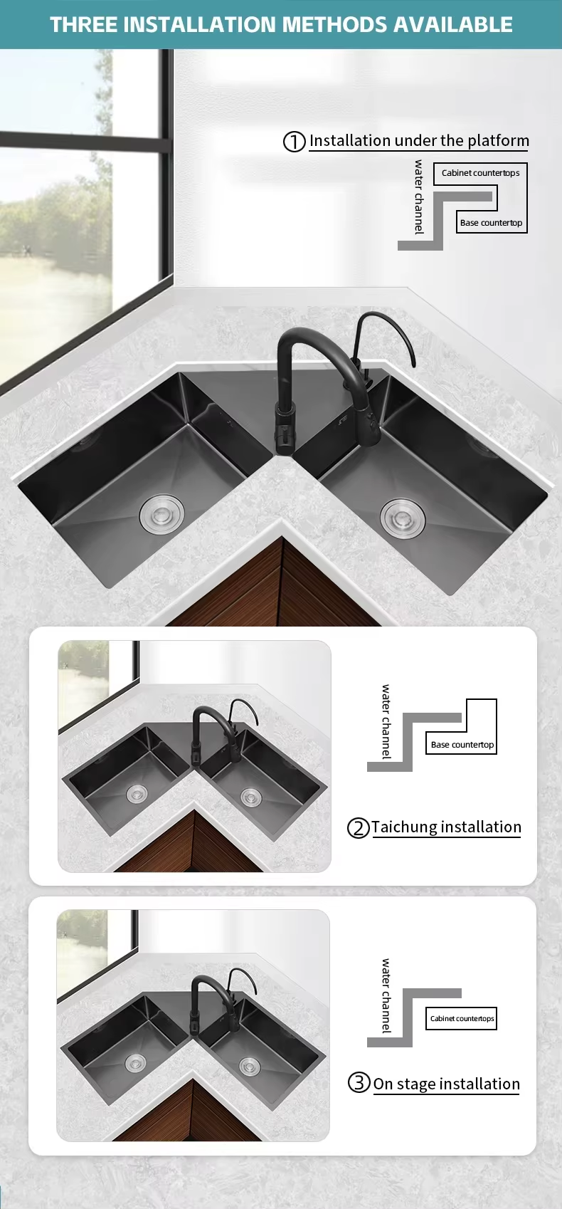 This stylish corner-mounted sink offers a smart solution for kitchens short on space. With two deep basins and a rotating faucet, it combines efficiency and elegance in one streamlined design.