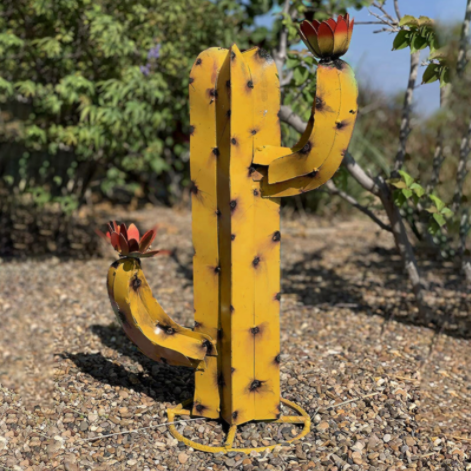 The cactus decor is a creative way to add some flair to your home. This product is metal art cactus decor that can be used indoors or outdoors and does not require water.