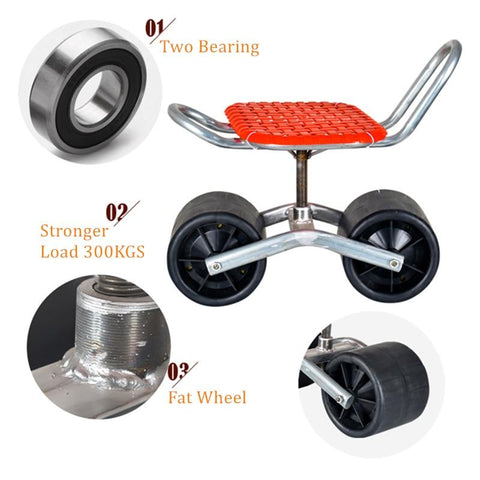 This rotatable wheeled garden stool has a 360-degree swivel base that allows the garden stool to rotate 360 degrees, making it easy to turn around for picking up dropped tools or plants close by.