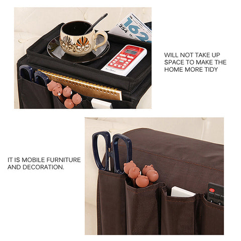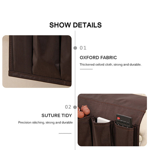 - This sofa storage bag is ideal for over most sofas, recliners,s and chair arms, sofa, which can accommodate your TV remote control, phones, magazines, notebooks, pens, glasses, snacks, and earphones, etc.