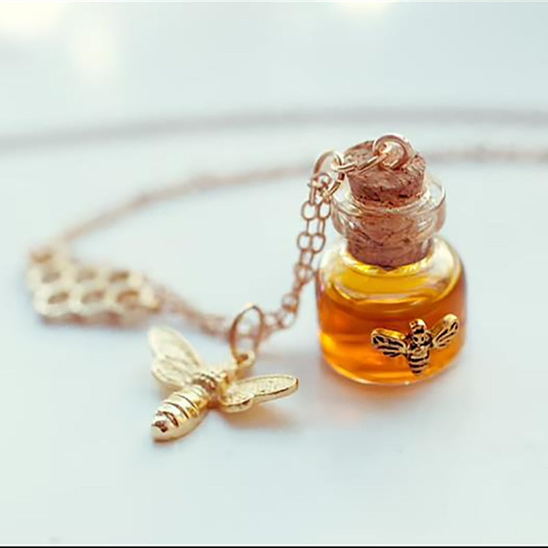 A beautiful Honey bottle-inspired handmade tiny glass necklace. The necklace is also decorated with an amazing golden bee charm and a Honeycomb connector. This Honey Charm Bee Bottle Necklace is the perfect accessory for any nature lover.