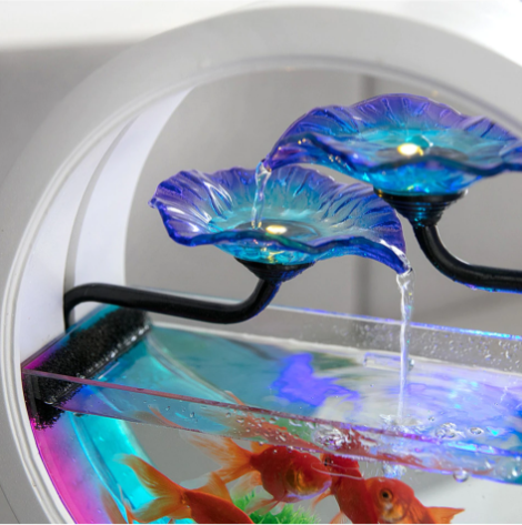 This product is a mini aquarium that has water in it and is perfect for any space. It also provides an ambient light so you can see your fish swimming around inside the tank. The sound of the water flowing from the top to the bottom of the tank will relax anyone who listens to it. This product would be great for people who want something beautiful and peaceful in their home or office.