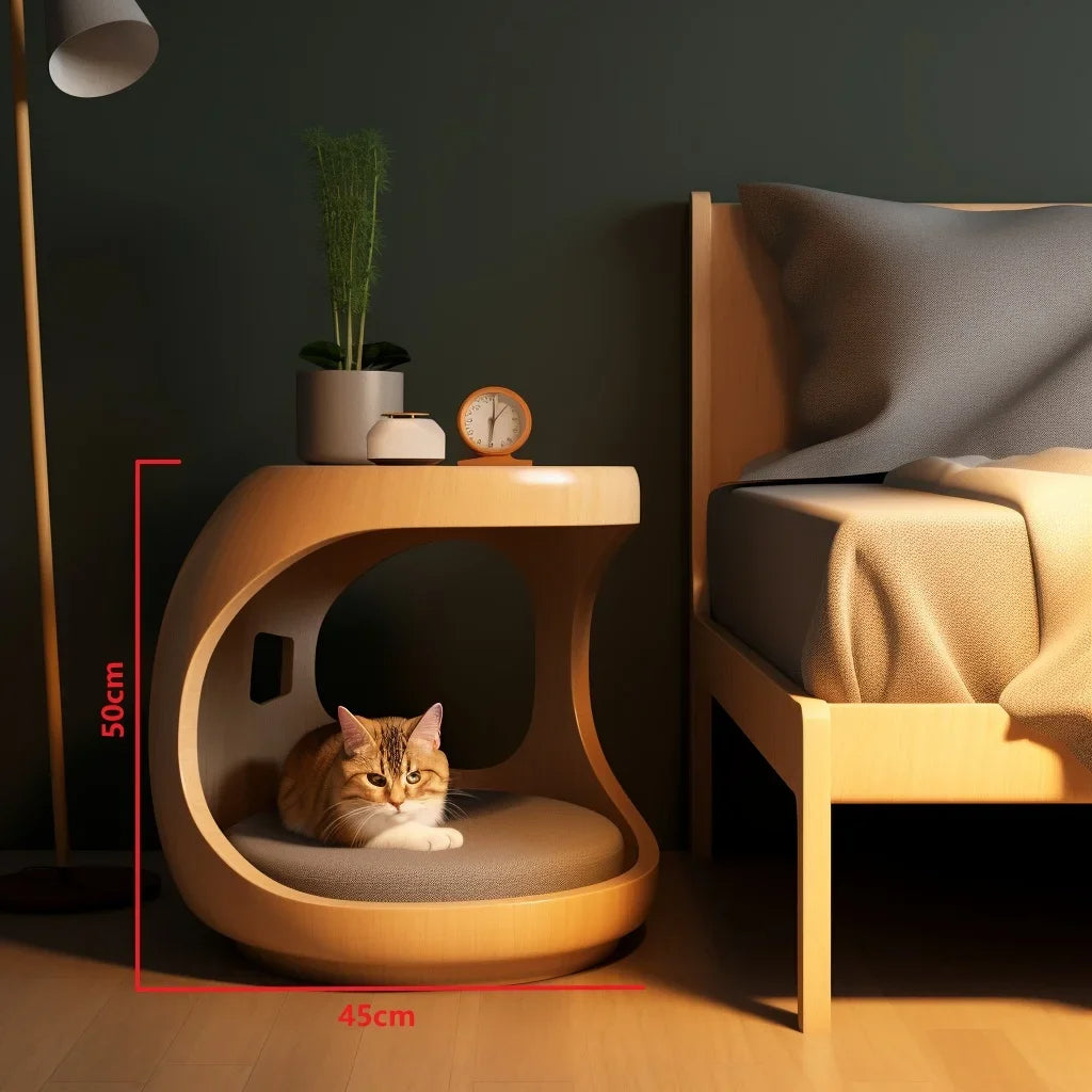 Crafted from high-quality materials, it features a spacious compartment where your cat can curl up comfortably while also providing surface space for lamps, books, or personal items. Its thoughtful design ensures that your pet has a designated spot to rest without compromising your aesthetic.