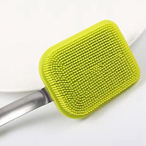 Made from SILICONE with NO smelly odor, Germ-FREE scrubber! Stainless steel handle.SAFE to use on non-stick cookware, delicate glassware,