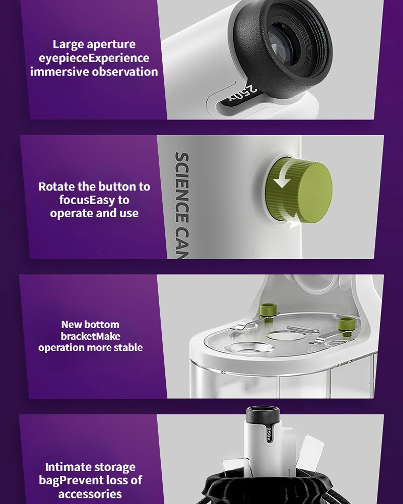 - Small and portable, specially designed for children with light palm size and egg weight, but it integrates specimen collection, production and observation. It is portable, easy to operate, and can easily lead children into the micro world.