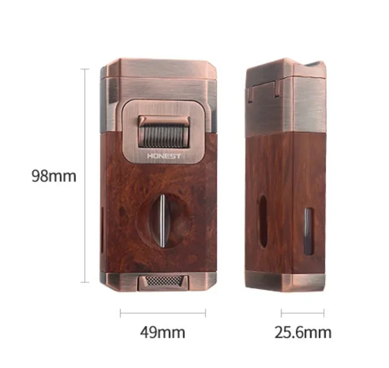 Upgrade your style and functionality with this sleek double jet flame lighter. Designed for outdoor durability, its windproof double-flame mechanism ensures reliable performance in all conditions. The refined metal and wood-like finish add a touch of sophistication, making it perfect for cigar enthusiasts or everyday use.?