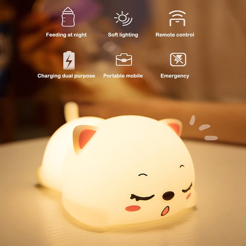 - The night light features a cat head with glowing eyes and a vertical slit for a nose, as well as a soft touch sensor at the base.