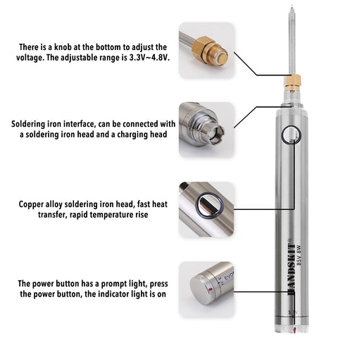 - The soldering iron interface can be connected with a soldering iron tip and a charging tip.