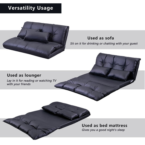 Made with an internal steel frame structure and stuffed with high-density foam, the surface of the whole PU leather. 2 leather pillows are also included to provide more relaxation and comfort. This sofa bed offers comfort and support for floor seating. With the durable and sturdy steel frame, the back can be easily adjusted from 75 to 180 degrees from flat to upright with 5 different positions. Perfect for small spaces, this lightweight, versatile chair can be easily moved around and placed on any clean and dry surface.