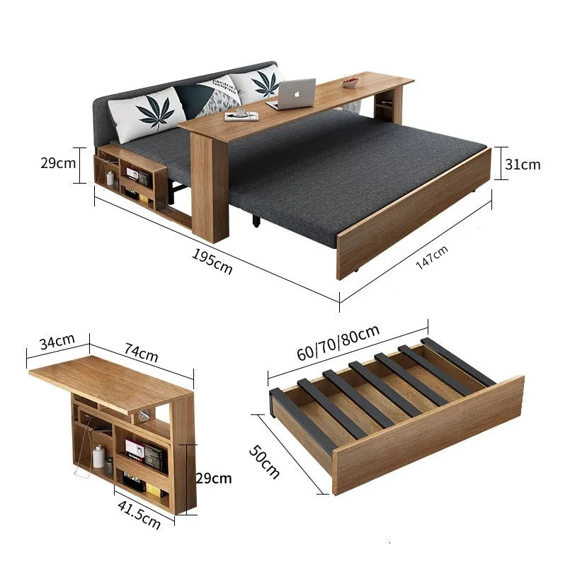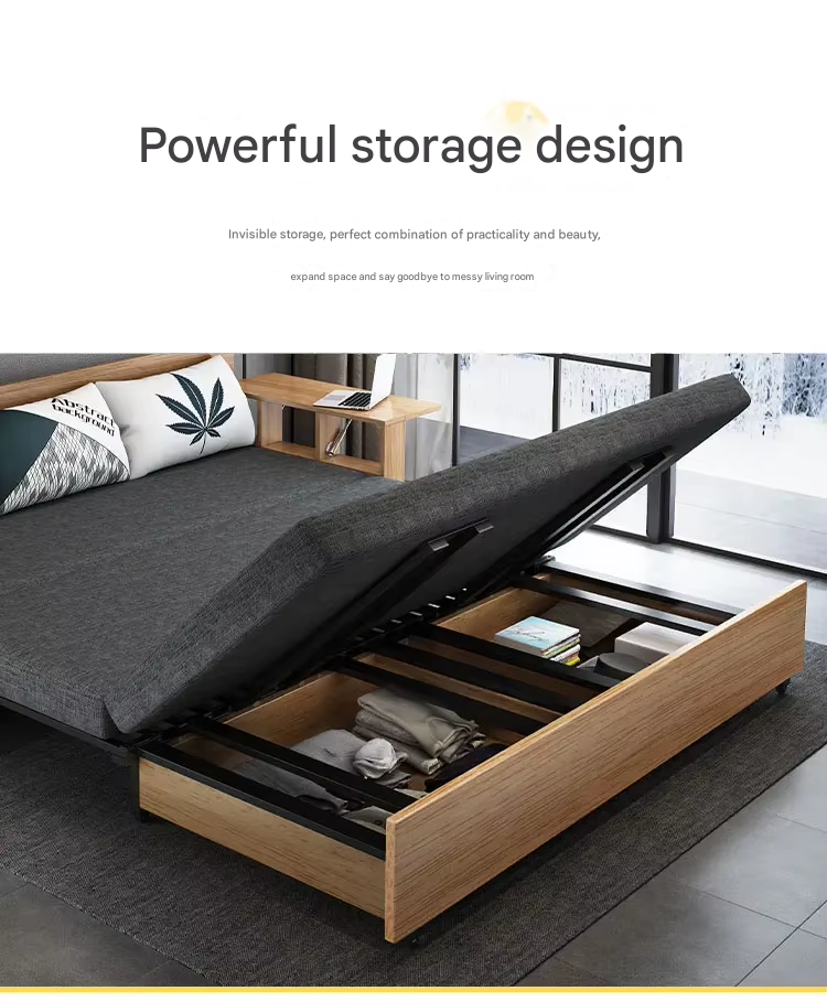 This modern, transformable sofa bed is the ultimate space-saving solution for compact homes. Seamlessly switch between a sleek sofa and a comfortable bed while enjoying the added functionality of built-in storage and a versatile wooden design. Ideal for living rooms, guest rooms, or studio apartments, it combines style and practicality in one.