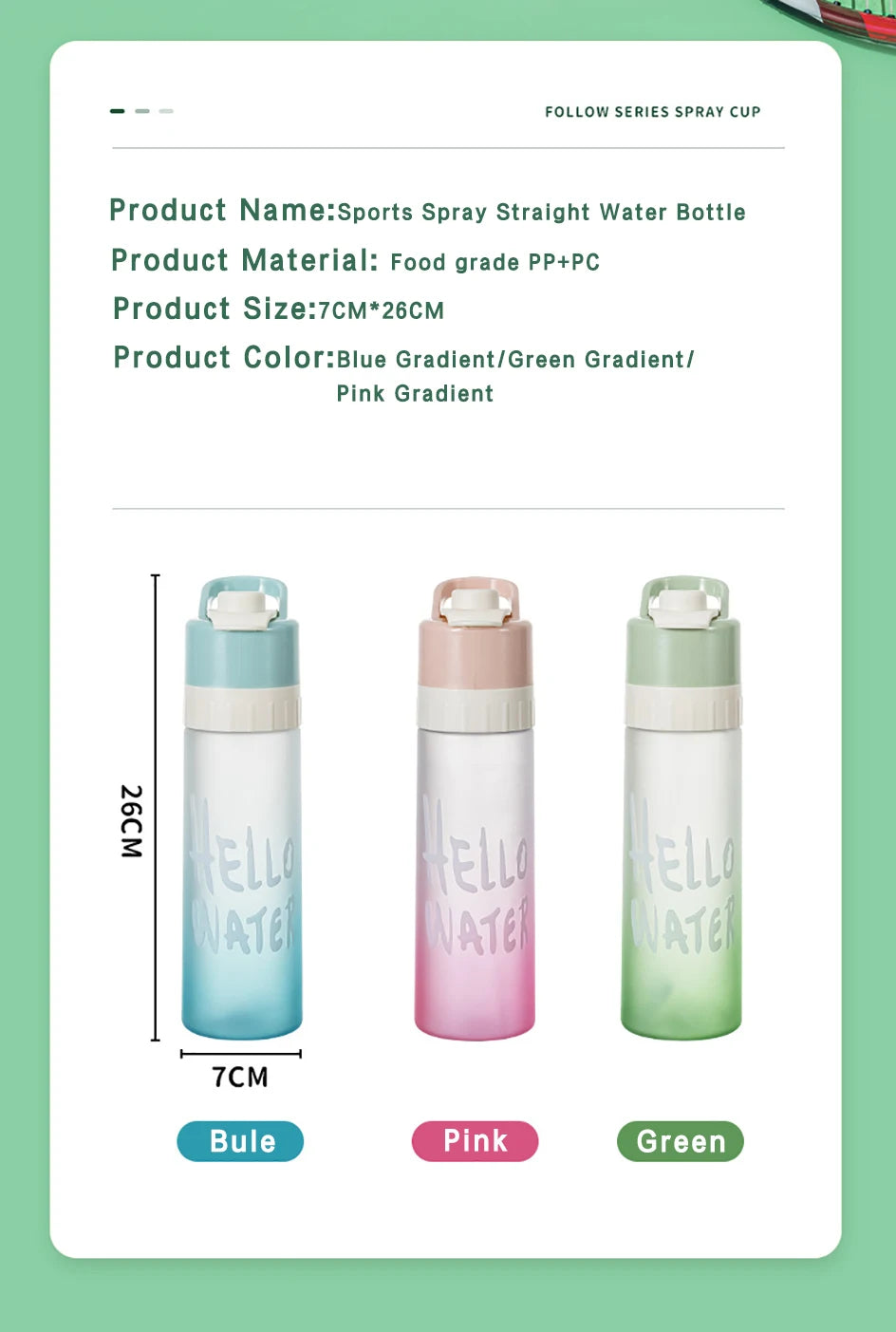 Featuring a thoughtful design, the bottom of the bottle is thickened for stability and wear-resistance, while the silicone seal ring guarantees a leak-proof seal. The frosted cup body provides a smooth feel, and the nano-sized nozzle sprays a refreshing mist evenly on hot summer days with just one press of a button. The all-in-one handle adds convenience to carrying and using this innovative water bottle.