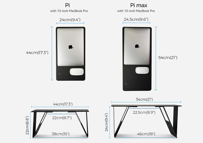[Pi v.s.Pi Max] We highly recommend buying Pi Max if you prefer roomier space over your lap, or you want to use it to support a large laptop. The dimensions are Pi: 17.3 x 9.4 x 0.5″; Pi Max: 21.3 x 9.6 x 0.5″.