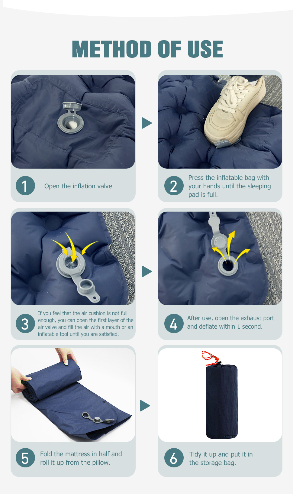 Inflatable Built-in Pillow Nature Nest Camping Bed. This innovative and easy-to-use inflatable bed is designed to provide a comfortable and restful night’s sleep in the great outdoors, featuring a built-in pillow for added support and a compact, lightweight design for effortless portability.