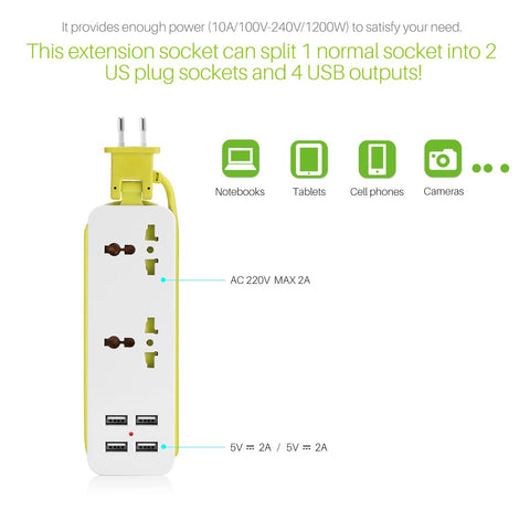 This extension socket can split 1 normal socket into 2 EU plug sockets and 4 USB outputs! Great for charging notebooks, Cell phones, tablets, cameras, MP3 players and more. It provides enough power (10A/100V-240V/1200W) to satisfy your need. Compact size and lightweight, perfect design for your home travel or workstation. It allows you to charge more than one device simultaneously on the trip, especially at airports, hotels and etc.