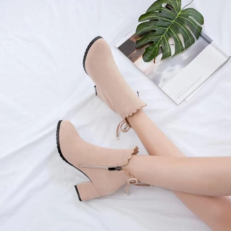 These chic ankle boots feature a unique scalloped edge design that adds a touch of sophistication to your autumn wardrobe. Crafted from premium suede, they offer both comfort and style. The boots are adorned with a subtle pearl detail on the back ribbon, elevating your outfit whether you’re heading to a casual outing or a formal event. With a comfortable block heel, they are perfect for all-day wear, providing both fashion and function.