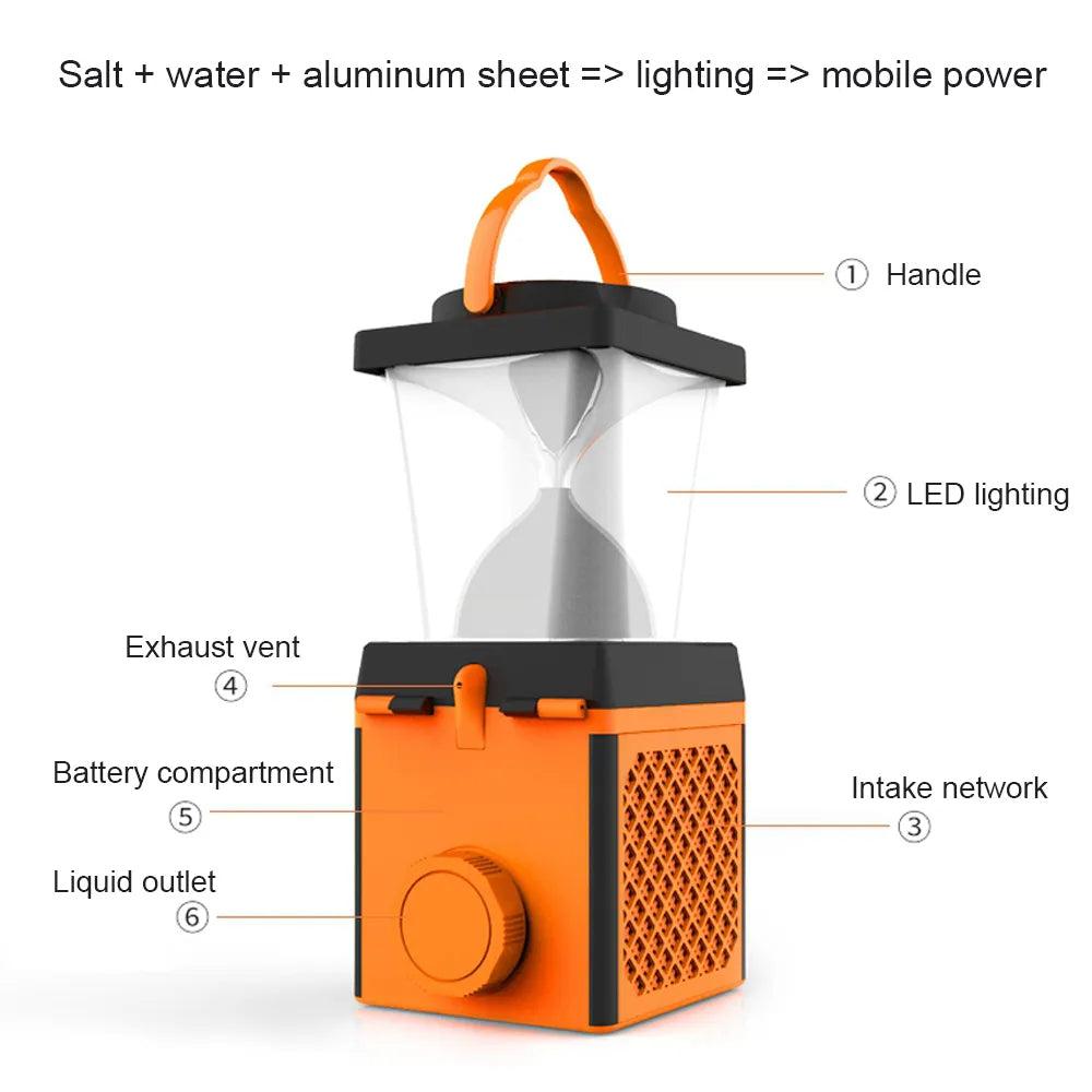 An eco-friendly lighting solution for your outdoor adventures. Using the innovative principle of extracting energy from saltwater, this lamp eliminates the need for traditional batteries, making it a sustainable choice for environmentally-conscious travelers.? ??