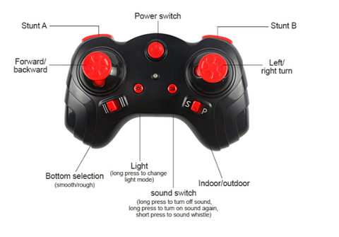 The product has: forward, backward, turn left, turn right, indoor mode, outdoor mode, terrain switching, in situ U-turn, self-stabilizing balance, 360-degree drift, stunt single wheel stand, and other functions.