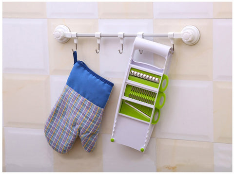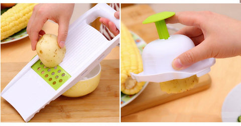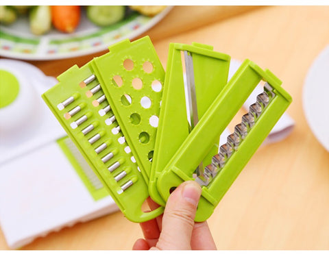 Safely slice and grate in seconds. Versatile 5-in-1 mandolin slicer & grater includes 1 stationary and 4 interchangeable, ABS plastic frame, stainless steel blades. Blades stored inside for convenience when not in use. Vegetable slicer and dicer feature an easy-grip handle, safety guard and grooves that keep it securely in place over a bowl.