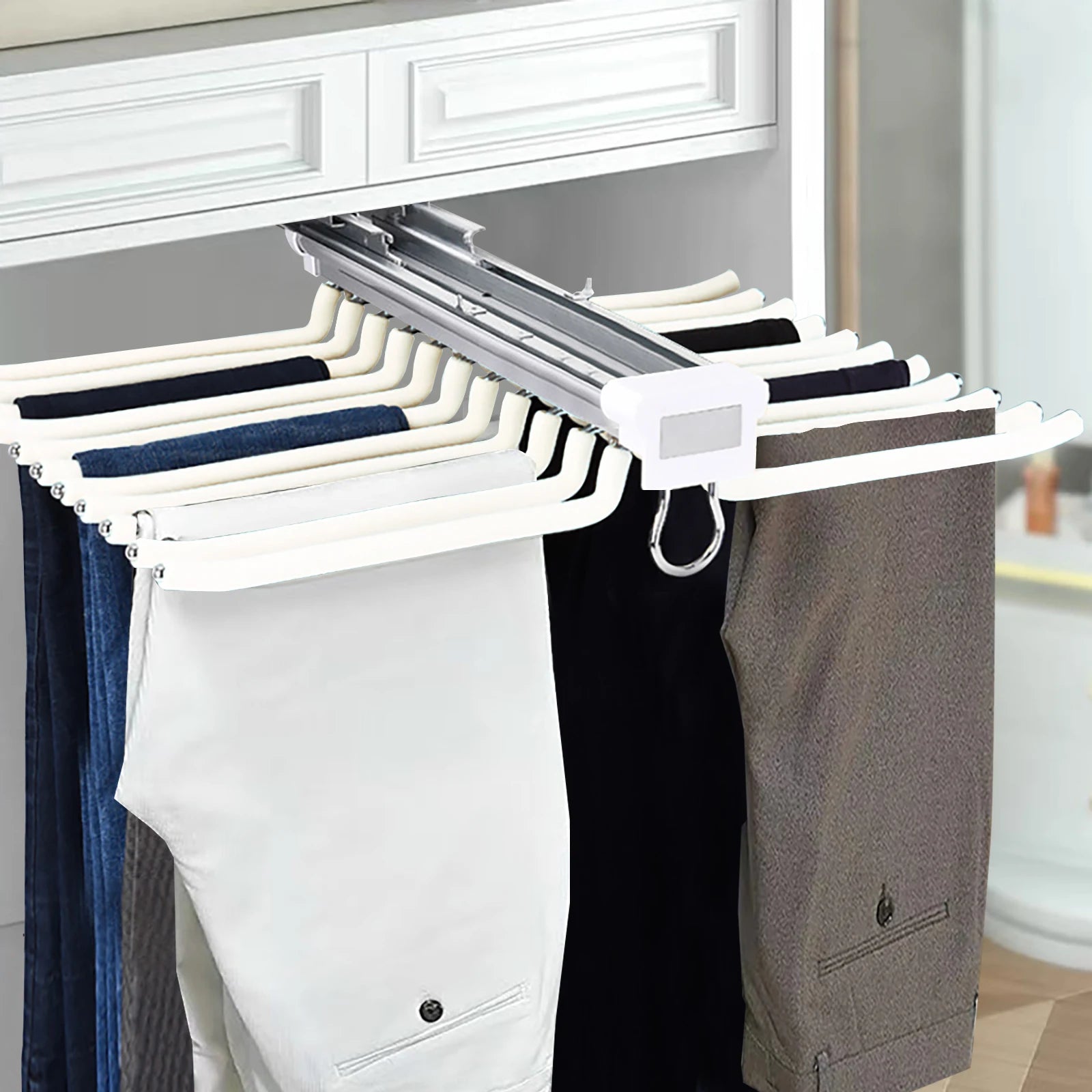Maximize your wardrobe storage with the Smart Slide-Out Rail Cloth Organizer. Designed to accommodate up to 22 pairs of trousers, this organizer is perfect for those seeking a tidy and efficient solution for their clothing. With its solid stainless steel poles and ABS base, it offers long-lasting durability and exceptional strength. The silent damping rail system ensures smooth and quiet operation, while the thickened body adds to its toughness and corrosion resistance.?