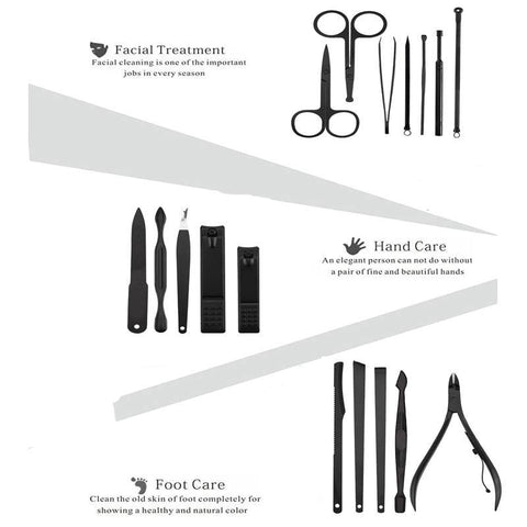 Nail Manicure Set Packing: Manicure set 16 in 1 includes 2 nail clippers, 1 Large Nail Clipper, 1 Cuticle Nipper, 1 Nail File, 1 Dead Skin Fork, 1 Tweezer, 2 Scissors, 1 Nail Cleaning Knife, 1 Cuspidal/Obtuse push-type broach, 2 Ear Pick, 2 Acne Tool, 1 Flat Callus Remover, 1 Oblique Callus Remover, 1 Zigzag Callus Remover.