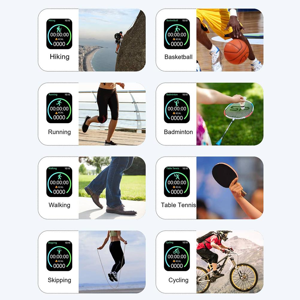 Smartwatch with 1.69-inch high-definition touch screen, 240*280 pixel resolution. With soft and breathable straps, both men and women are very comfortable to wear and look stylish. Larger Display An always-on option, your information is always at a glance. The smart watch records your daily exercise in detail, including running, climbing, cycling, calorie consumption, etc. More sports, more different ways to record. Not only these, monitoring heart rate and blood pressure can also check and better understand your body at any time. Automatic sleep tracking of your sleep patterns, comprehensive analysis of your sleep quality, and reasonable adjustments to your lifestyle.