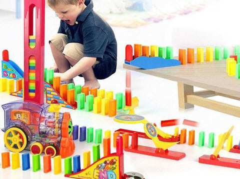 Fill the cartridge and start the train to lay the dominoes. All the dominoes are brought together to help create the coolest dominoes you can imagine. Rack them up and knock them down.