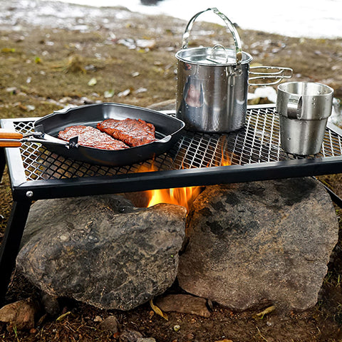 Designed for cooking over an open fire. Fold up legs, it can be used as a storage rack.