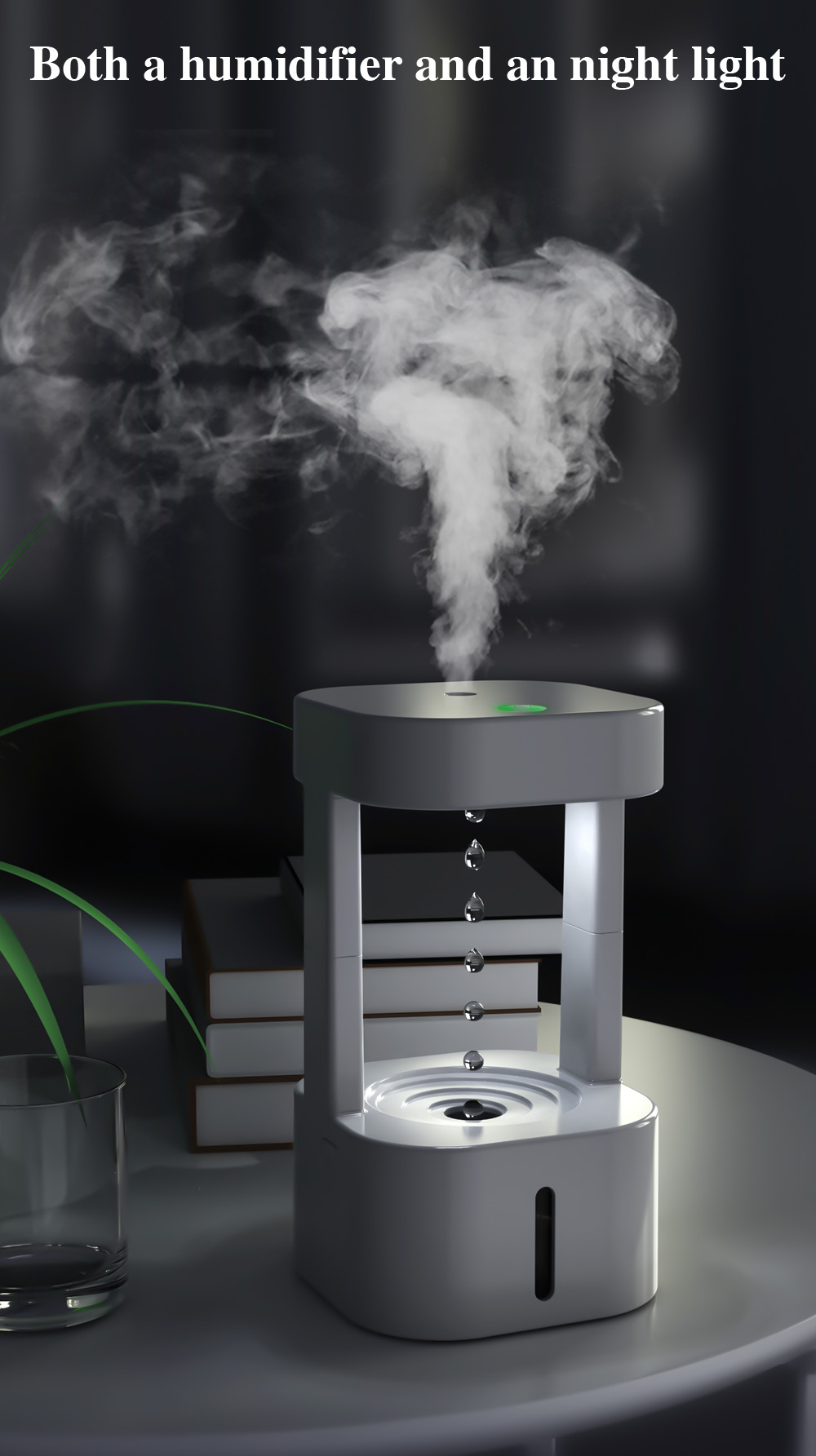 - Innovative anti-gravity design. This humidifier uses optical technology to create the illusion of anti-gravity, making water droplets appear to flow slowly upward while producing environmental luster and the soothing sound of flowing water.