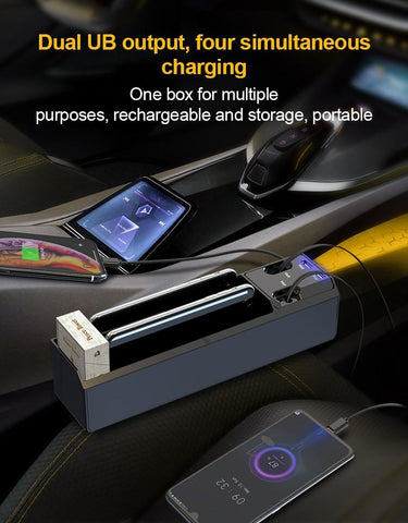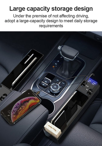 The Universal Car Seat USB Charger Gap Organizer is a car interior stowing and tidying product. Comes with QC3.0 fast charging type-c data cable + Apple data cable + dual USB output, phone slot + storage slot + wallet / cigarette. This innovative design allows you to charge your phones or other gadgets while they are still inside the pockets of the organizer so that there is no need to take them out every time you want to charge them. The Universal Car Seat USB