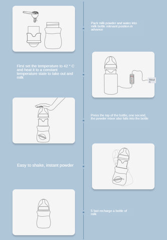Put the baby bottle into the thermostat, connect it to the power source, and press and hold the power button for 3 seconds to turn on the thermostat. If you need to adjust the temperature, press and hold “+” or “—” to increase or decrease the set temperature when it flashes. After adjusting the required temperature, it flashes several times and automatically saves it. The next time you turn it on, it will default to the last set temperature.