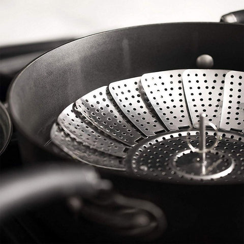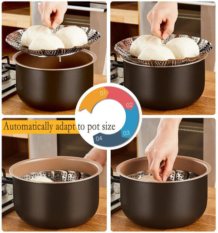 The steamer basket can collapse for storage and expand to fit various sizes of pots/pans and pressure cookers, turning your favorite pot into a safe steamer. It opens like a water lily and folds compactly to save storage space.
