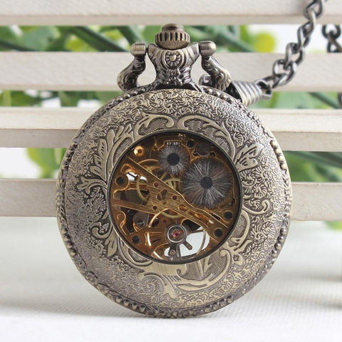 Classic and elegant silver-tone Roman numeral design exhibition covered pocket watch. Intricately designed front cover opens to expose beautiful silver Roman numeral dial with exhibition center to display movement and its moving parts. Perfect addition to a formal or casual dressing or collection.