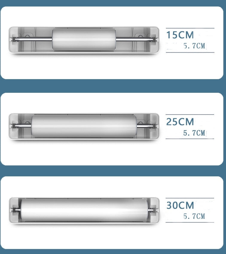 This dispenser is attractive and easy to use. It not only can cut plastic film but also can cut aluminum foil. You can interchange both of them on this dispenser. Smoothly to cut. It will help you prep or clean up in a kitchen quickly and efficiently. Perfectly even cuts 99% of the time. Besides, it fits easily in a kitchen drawer; the 16 suction cups on the bottom of this dispenser work very well-they can fix the kitchen counter, smooth desktop, refrigerator, etc.