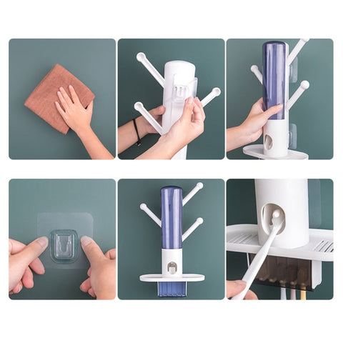 Multi-functional toothbrush holder + toothpaste dispenser + cups set.A good way to organize your toothbrushes, toothpaste, and rinse cups, saving space and keeping your bathroom countertop tidy. One-touch automatically squeezes the appropriate amount of toothpaste through the toothpaste dispenser.