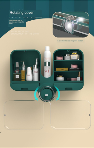 This is a beautiful wall-mounted makeup organizer box. The box has four separate compartments to hold your cosmetics in place and the top of the unit rotates open for easy access.