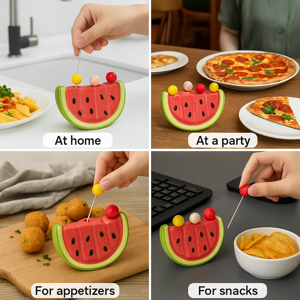Brighten up your table with this eye-catching fruit fork set. Shaped like a juicy watermelon slice, it includes charming, round-tipped bite sticks that are both functional and decorative.