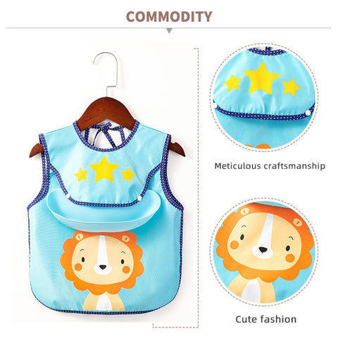 This crumb catcher keeps food and liquid off the floor! The pocket can also be flipped to the back, turning the sleeved bib into a smock apron.
