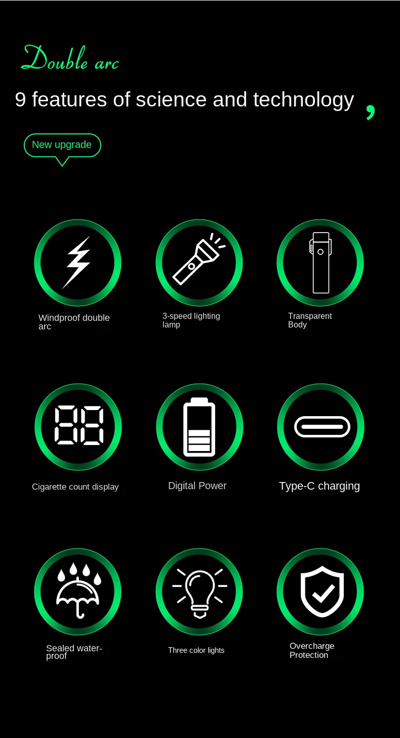 The Windproof Double Arc Transparent Flashlight Lighter is a perfect blend of functionality and style. This is more than just a tool for lighting your cigars or campfires. Here’s what sets it apart: